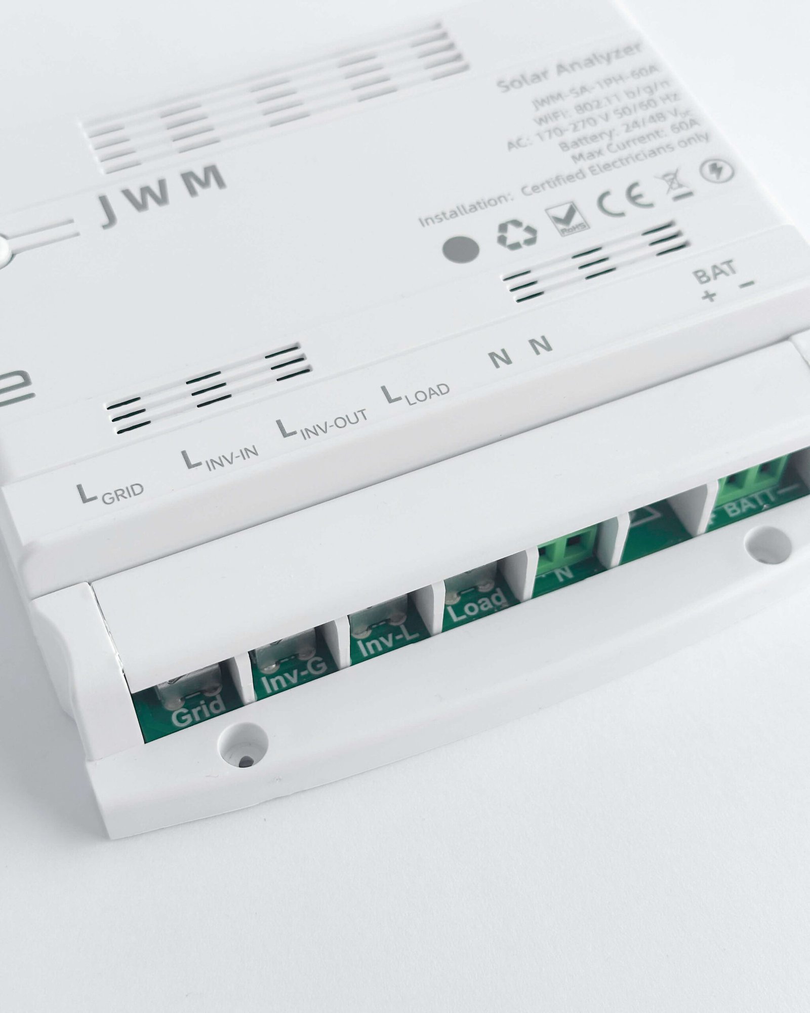 The JWM-SA-1PH-60A solar analyzer is a dedicated metering device designed to be used with single phase solar inverters. Its primary function is to measure the power and energy of your grid input and load output and it is designed for use with inverters that lack integrated monitoring capabilities.